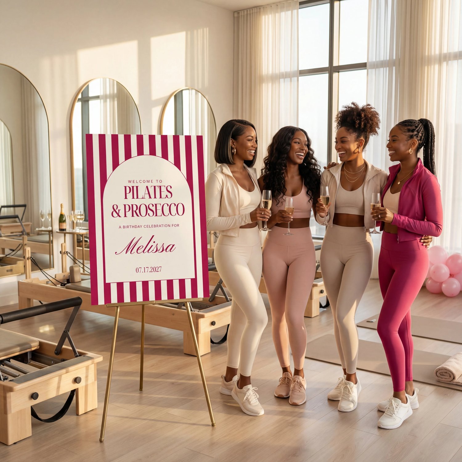 Make your entrance a whole moment with this Pilates Welcome Sign designed for a “Pilates and Prosecco” birthday party!