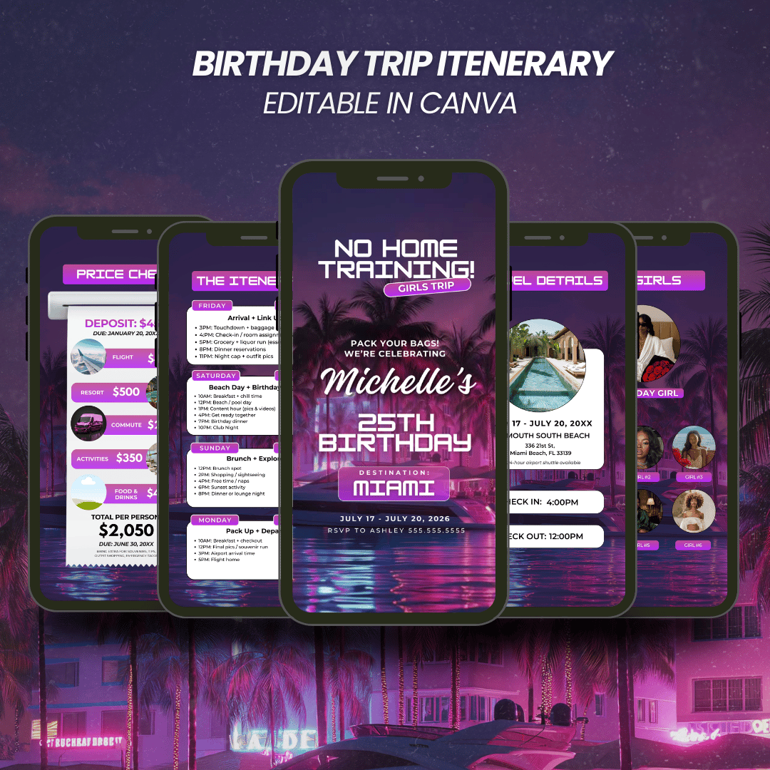 This Birthday Trip Itinerary Template is your cute, organized, group-chat-approved way to keep the weekend running smooth — without sending 100 messages or repeating yourself 12 times.