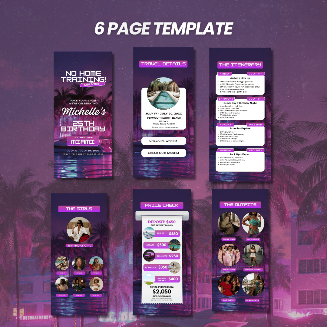 This template is perfect for girls trips, birthday getaways, group vacations, and weekend trips, and it’s designed to look like a luxury travel invite… but function like a real itinerary.