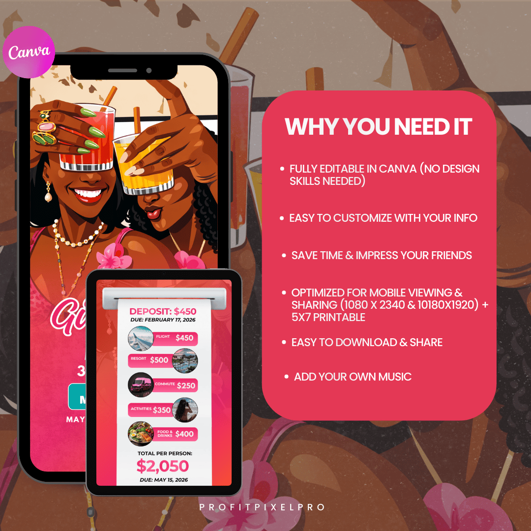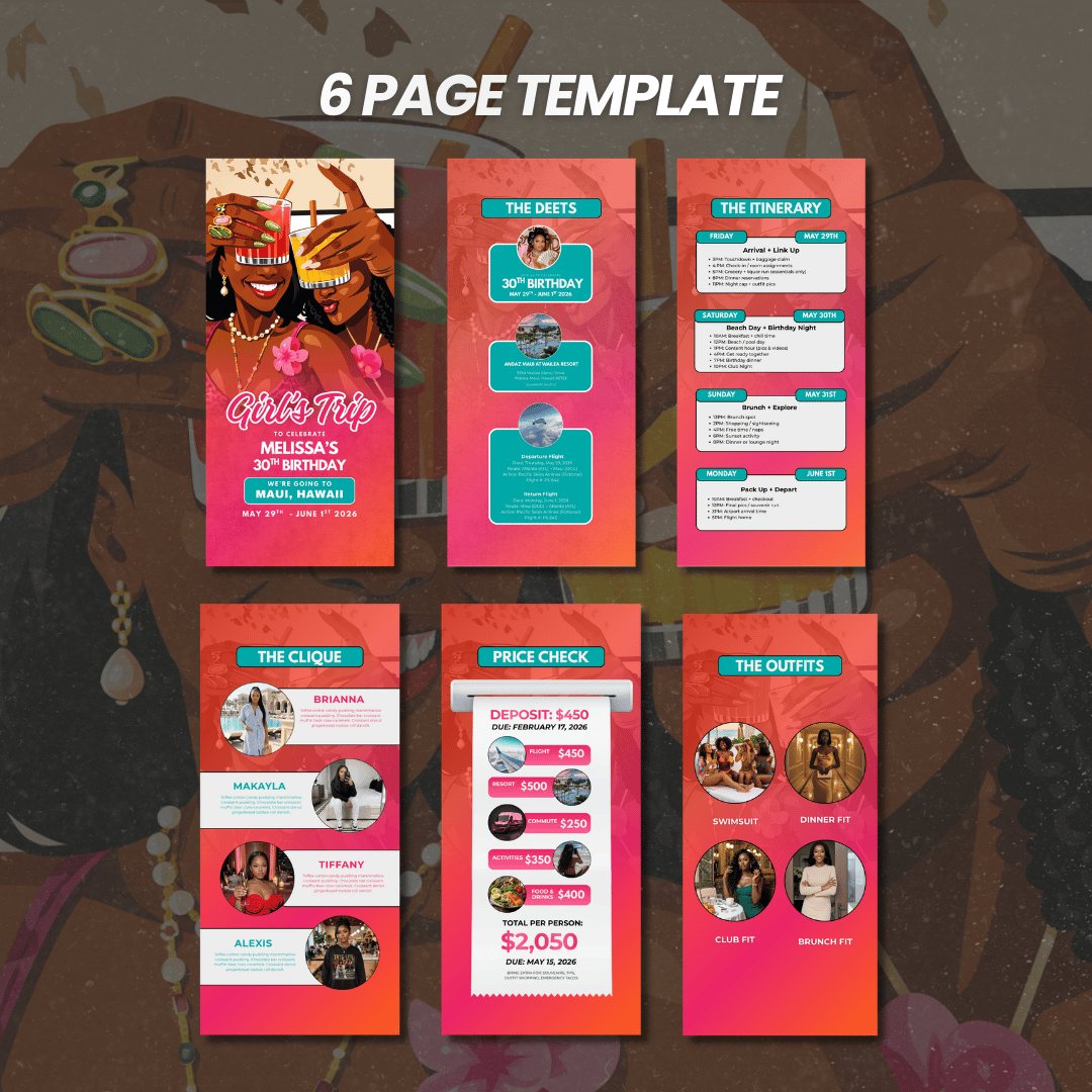 This template is perfect for girls trips, birthday getaways, group vacations, and weekend trips, and it’s designed to look like a luxury travel invite… but function like a real itinerary.