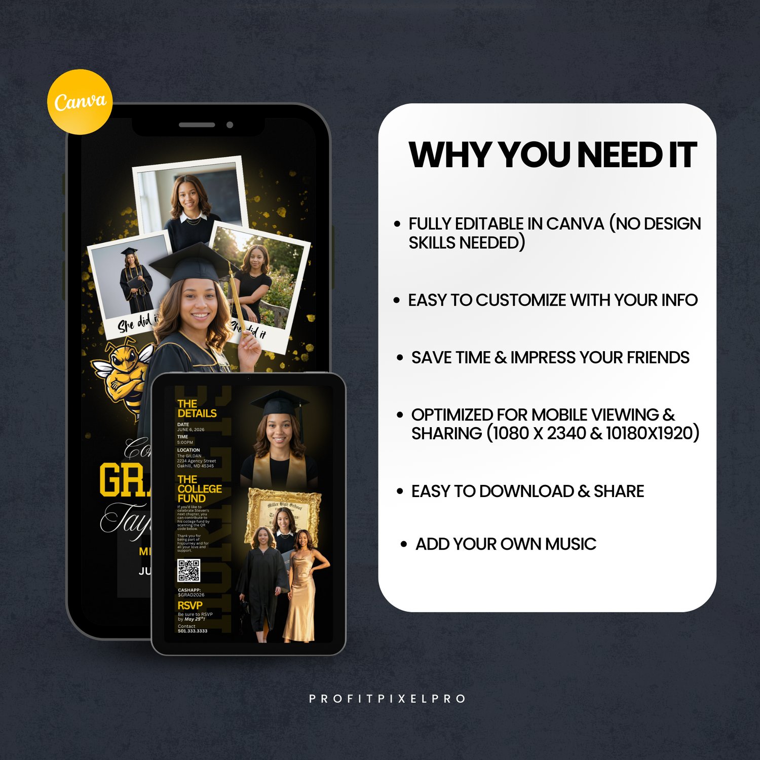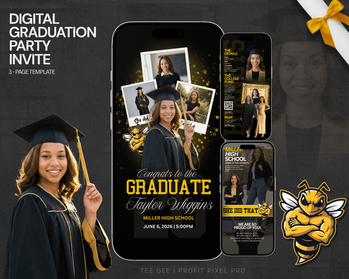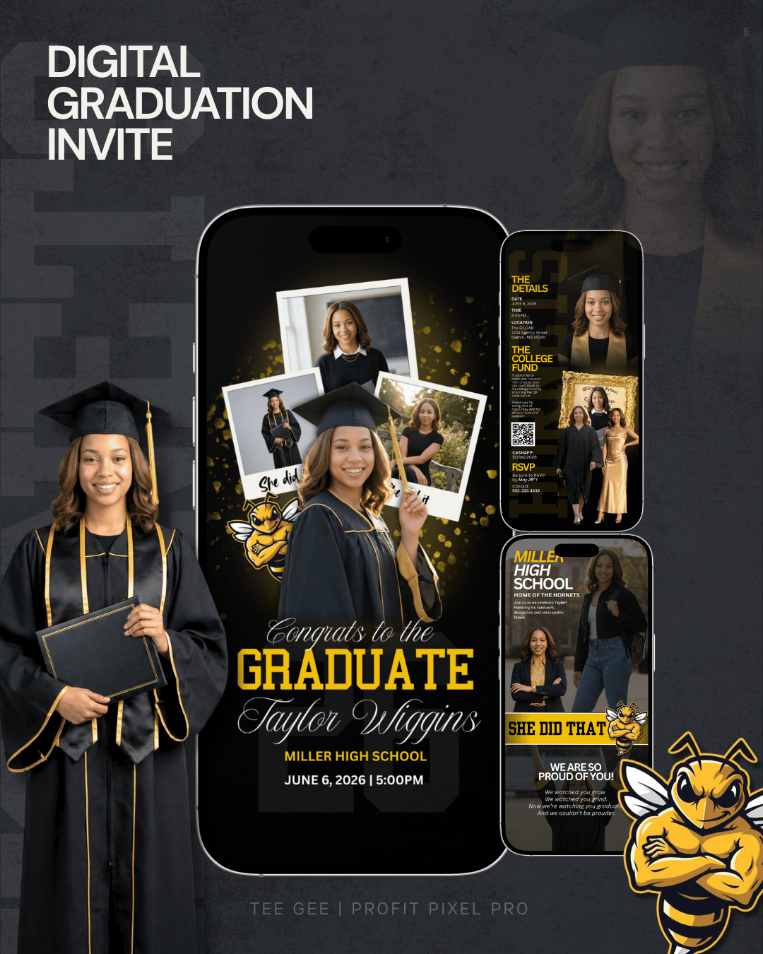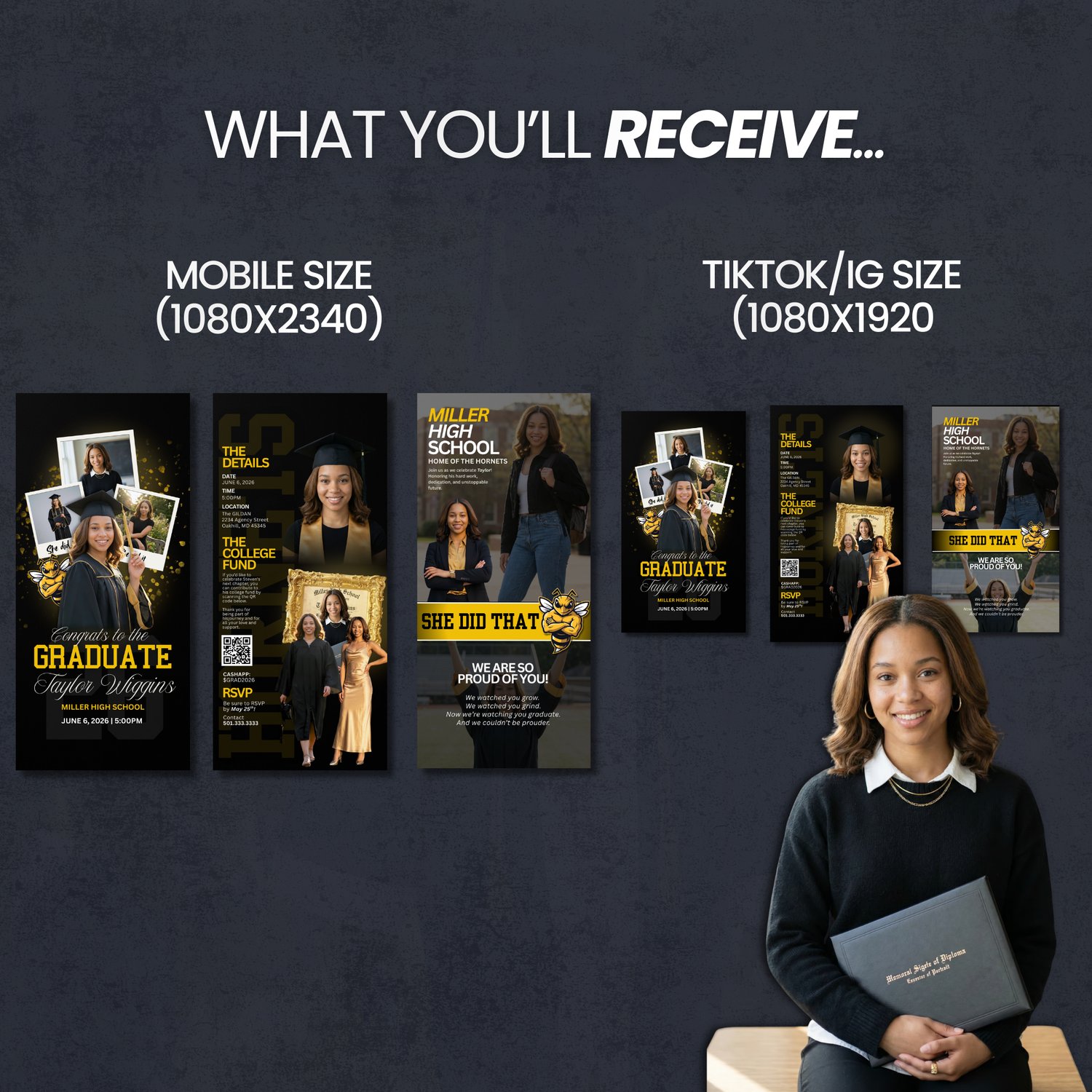 This high-impact digital graduation design transforms your student’s story into a professional, magazine-style layout that highlights: