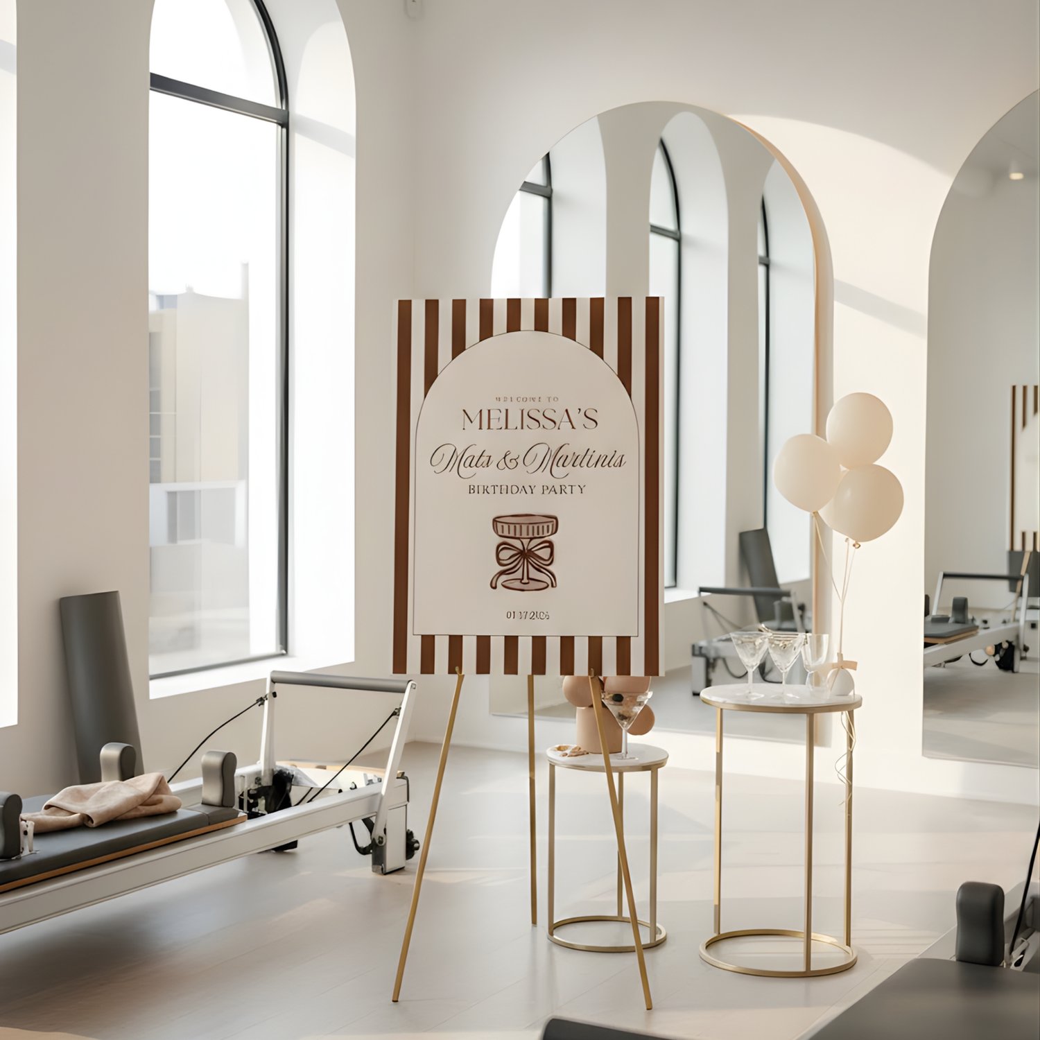 Make your entrance a whole moment with this Pilates Welcome Sign designed for a “Mats & Martinis” birthday party!