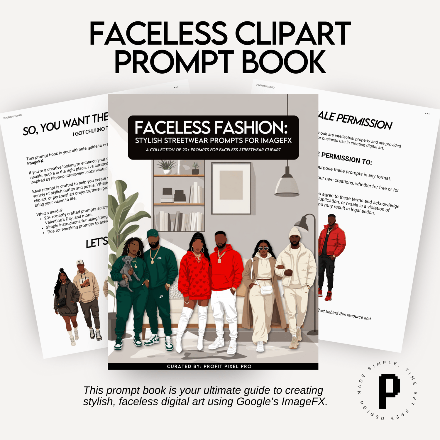 Step into the future of digital creativity with Faceless Fashion, your go-to prompt book for creating faceless, stylish characters using Google ImageFX—the latest trending platform in AI-generated art. Whether you’re designing clip art, social media visuals, or personal projects, these 20+ expertly crafted prompts will help you achieve a bold, cohesive aesthetic.