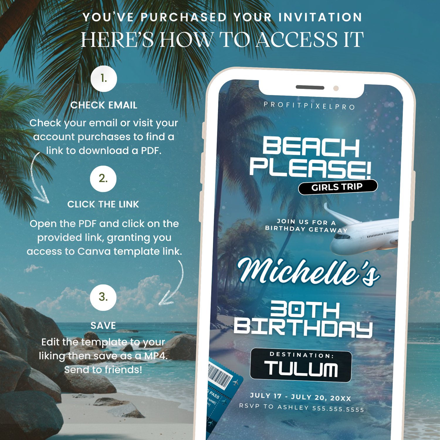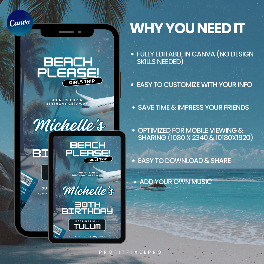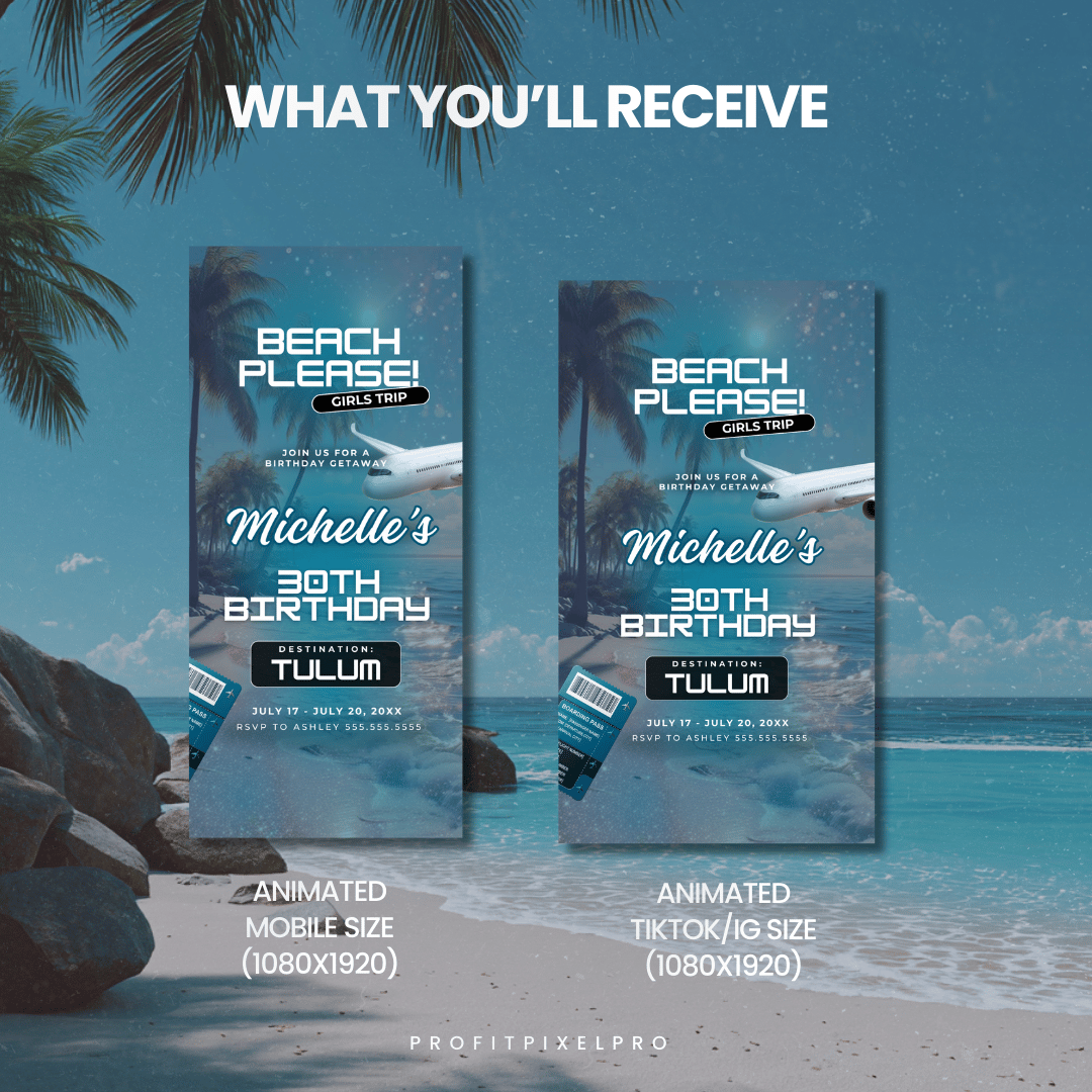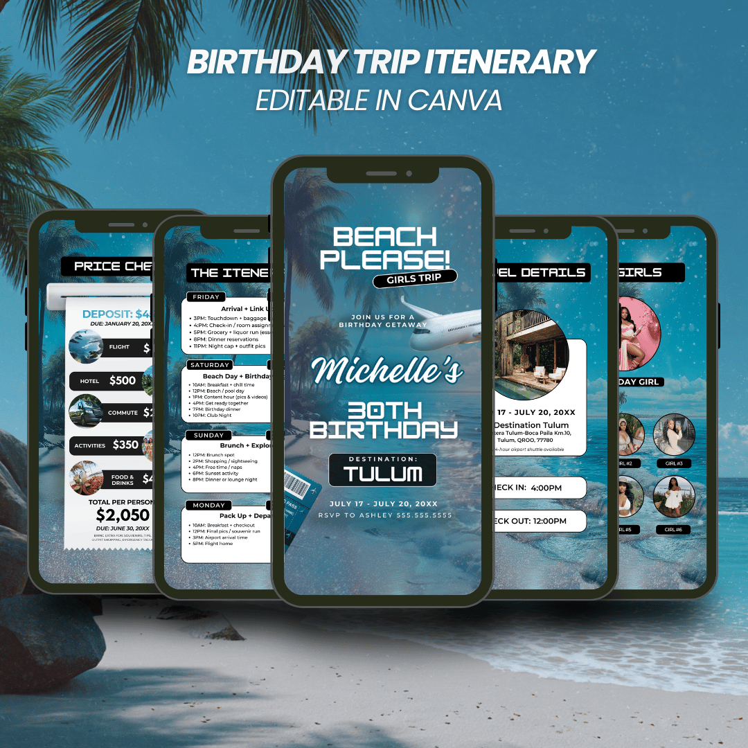 Animated Birthday Trip Itinerary Template | Girls Trip Digital Invite | Canva Editable Travel Schedule
