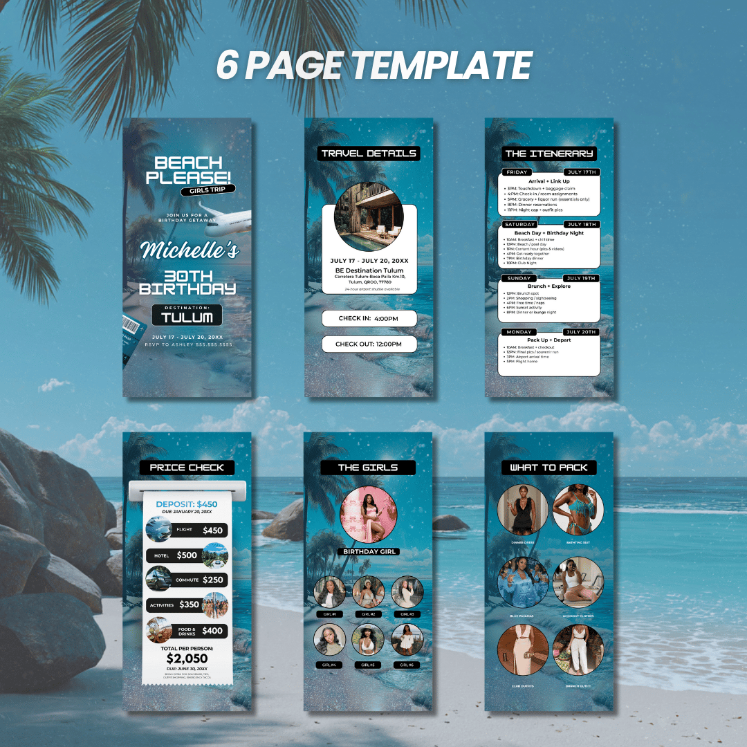 This template is perfect for girls trips, birthday getaways, group vacations, and weekend trips, and it’s designed to look like a luxury travel invite… but function like a real itinerary.
